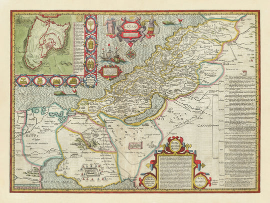 This beautiful and historic map of Canaan (Holy Land) was created by John Speed in 1611. It is a highly detailed map that shows the region as it was known at the time, including the locations of major cities, rivers, and mountains.