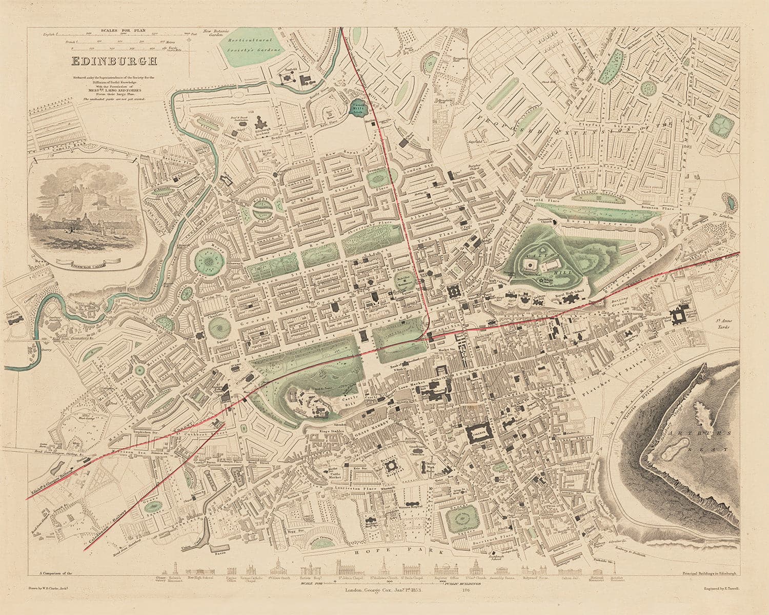 The Water of Leith is coloured a lovely blue and wends its way across the left side of the map. A highly detailed engraving of Edinburgh Castle is inset on the left.