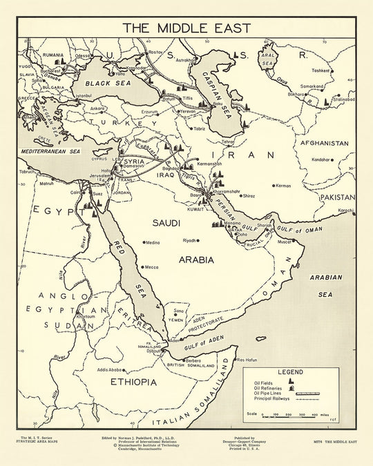 Step into the rich historical tapestry of the Middle East with this meticulously crafted map from 1950, created by the esteemed Norman J. Padelford, Ph.D., LL.D., a professor of International Relations at MIT. This map is part of the Massachusetts Institute of Technology's series of strategic area maps, designed to educate students on the geopolitical and economic landscapes of critical regions. It captures the nascent stages of the Middle East's oil industry, a sector that would soon become a cornerstone of global energy production and international relations.