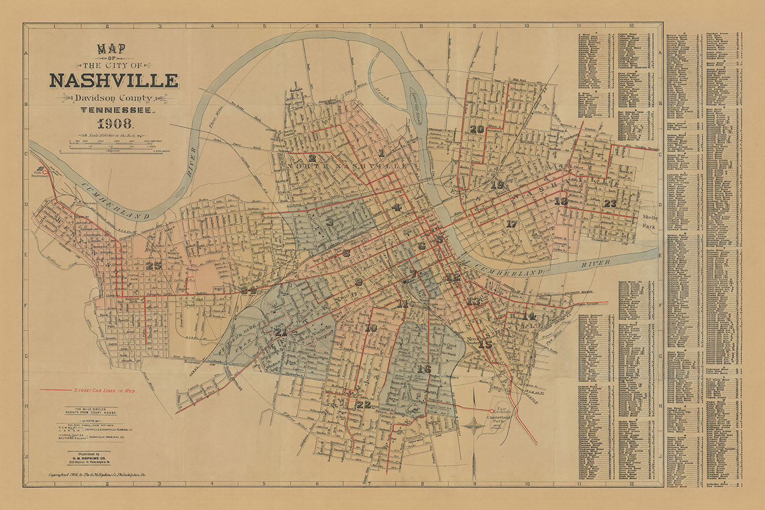Embark on a historical journey through the heart of Tennessee with the "Map of the City of Nashville, Davidson County," crafted in 1908 by the esteemed mapmaker G.M. Hopkins. This exquisite piece not only serves as a testament to Hopkins' dedication to precision and detail but also encapsulates a pivotal moment in Nashville's evolution. Known for his meticulous city maps across the United States, Hopkins' work on Nashville offers a unique bird's-eye view of the city, presenting a vivid tableau of its streets, landmarks, and the bustling life of the early 20th century. This map, with its hand-colored lithographic print, invites admirers to explore the intricate layout of Nashville, from the Cumberland River's meandering path to the distinguished Vanderbilt University, showcasing the city's growing prominence in the region.
