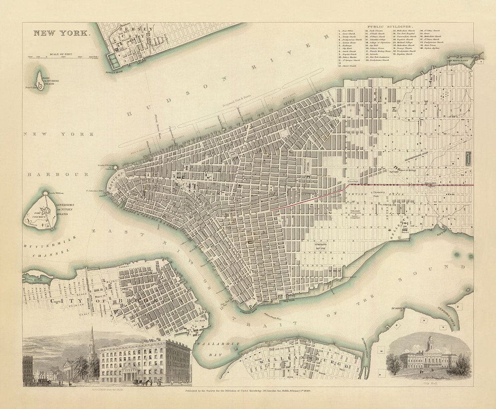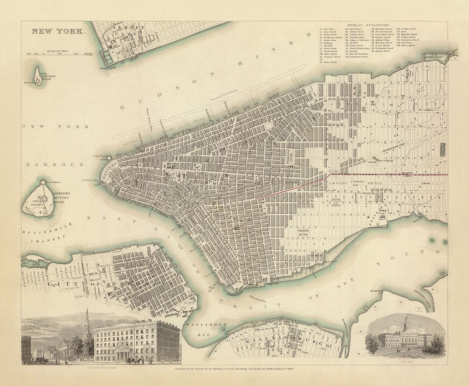 Old Map of New York, USA in 1840: Manhattan, Brooklyn, Williamsburg, Hudson River