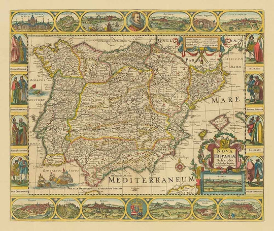 There's also a close-up view of Madrid, Lisbon, Seville, Barcelona, Granada and other cities around the edge of the map. There's even 8 pairs of figures to show you what Spanish people and fashion looked like back then. All in all, one of the finest old maps of Spain you can find.