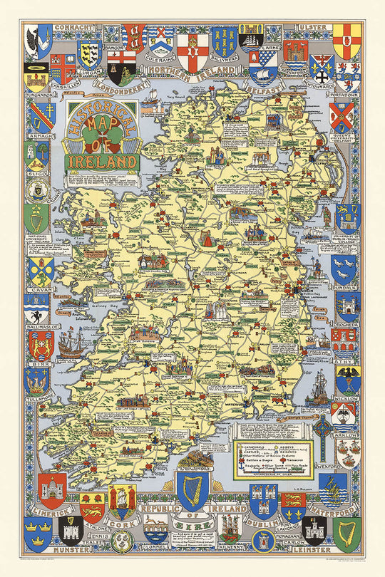 The "Historical Map of Ireland" is distinguished by its detailed portrayal of the coats of arms of Ireland's main cities and towns, a feature that adds a layer of heraldic significance and visual appeal. This decorative element, coupled with the map's comprehensive coverage of cathedrals, abbeys, castles, and battle sites, offers a window into the historical and cultural fabric of Ireland. Each symbol and illustration is carefully chosen to represent the thematic focus on history, making the map a colorful and informative guide to Ireland's storied past.