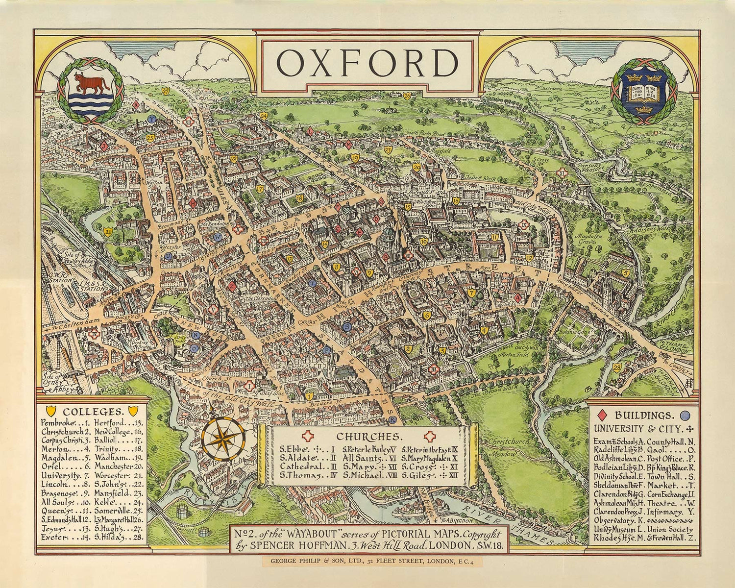 This lovely map of Oxford by Spencer Hoffman, dating from 1929, shows you that the city has hardly changed at all in the last 90 years (or indeed in the last 200 years!)