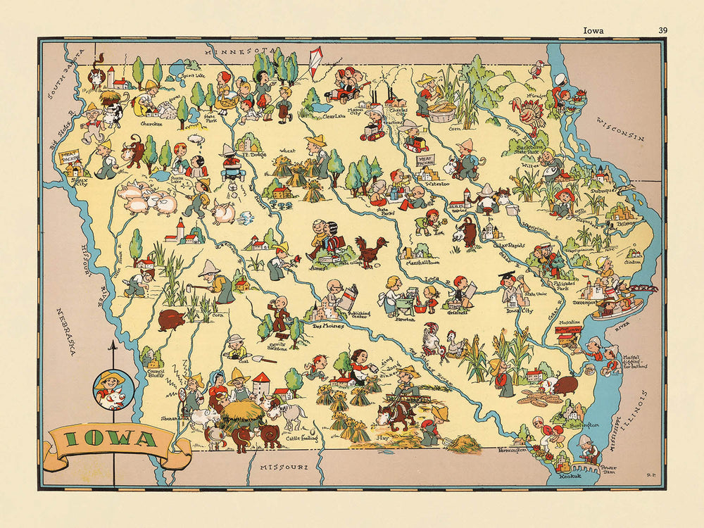 Pictorial Map of Iowa by Ruth Taylor White, 1935: Des Moines, Cedar Rapids, Davenport, Corn Farming, Mississippi River
