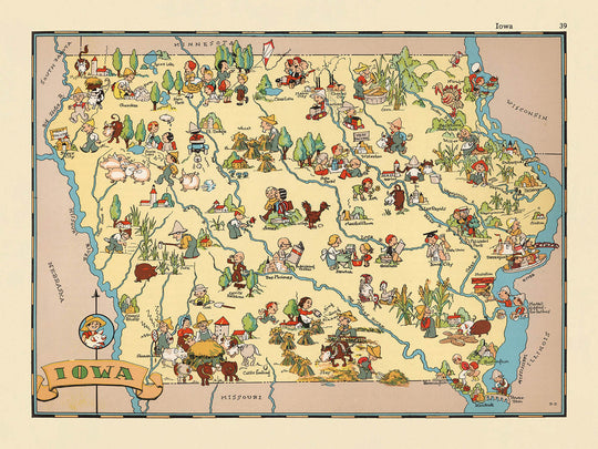 Step into the vibrant world of 1930s America with “Iowa,” the original title of this captivating pictorial map crafted by Ruth Taylor White in 1935. This map stands as a testament to the era’s fascination with regional identity, rendered in a whimsical, cartoon-like style that immediately draws the eye. It is part of a celebrated series of pictorial atlases, each offering a unique, playful perspective on the cultural and geographical essence of the American states. The map’s lively illustrations are not merely decorative; they are a visual narrative, encapsulating the spirit and charm of Iowa during a pivotal period in its history.
