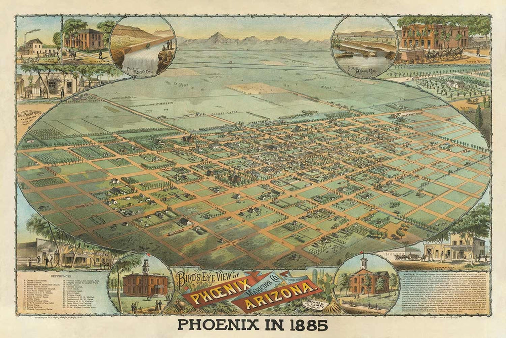 This map is unusually good for a birds eye map of a small town in 1885. It's probably one of the finest birds eye views ever made, and certainly the best old map of Phoenix ever published. It is also the first ever published map of Phoenix. Basically... it's an amazing map.