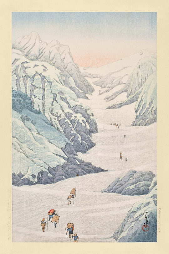 Snow Valley Climbers on Mt. Shirouma, crafted by the esteemed Japanese woodblock print master Hasui Kawase in 1935, captures a breathtaking moment of serene adventure within Japan’s winter mountainscape. Known in Japanese as “白馬の雪渓” (Shirouma no Sekkei), this iconic artwork illustrates climbers journeying through the shimmering, snow-laden valley of Mount Shirouma. Kawase's technical brilliance and sensitive eye for tranquil landscapes are evident, transporting the viewer directly into the silent, icy grandeur of Japan’s northern Alps.