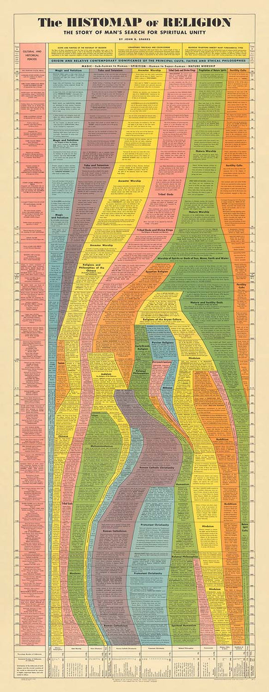"The Histomap of Religion" stands out for its ambitious scope, elegantly charting the progression and interplay of diverse religious traditions through a continuous logarithmic scale of time. The artwork's thoughtful use of colour—dominated by earthy tones of green, yellow, and warm ochre—guides the viewer's eye seamlessly through millennia, providing an intuitive grasp of the ebb and flow of spiritual ideas and practices across cultures and continents. This thoughtful colour palette and sophisticated design make the chart both visually appealing and intellectually stimulating, inviting repeated contemplation and study.
