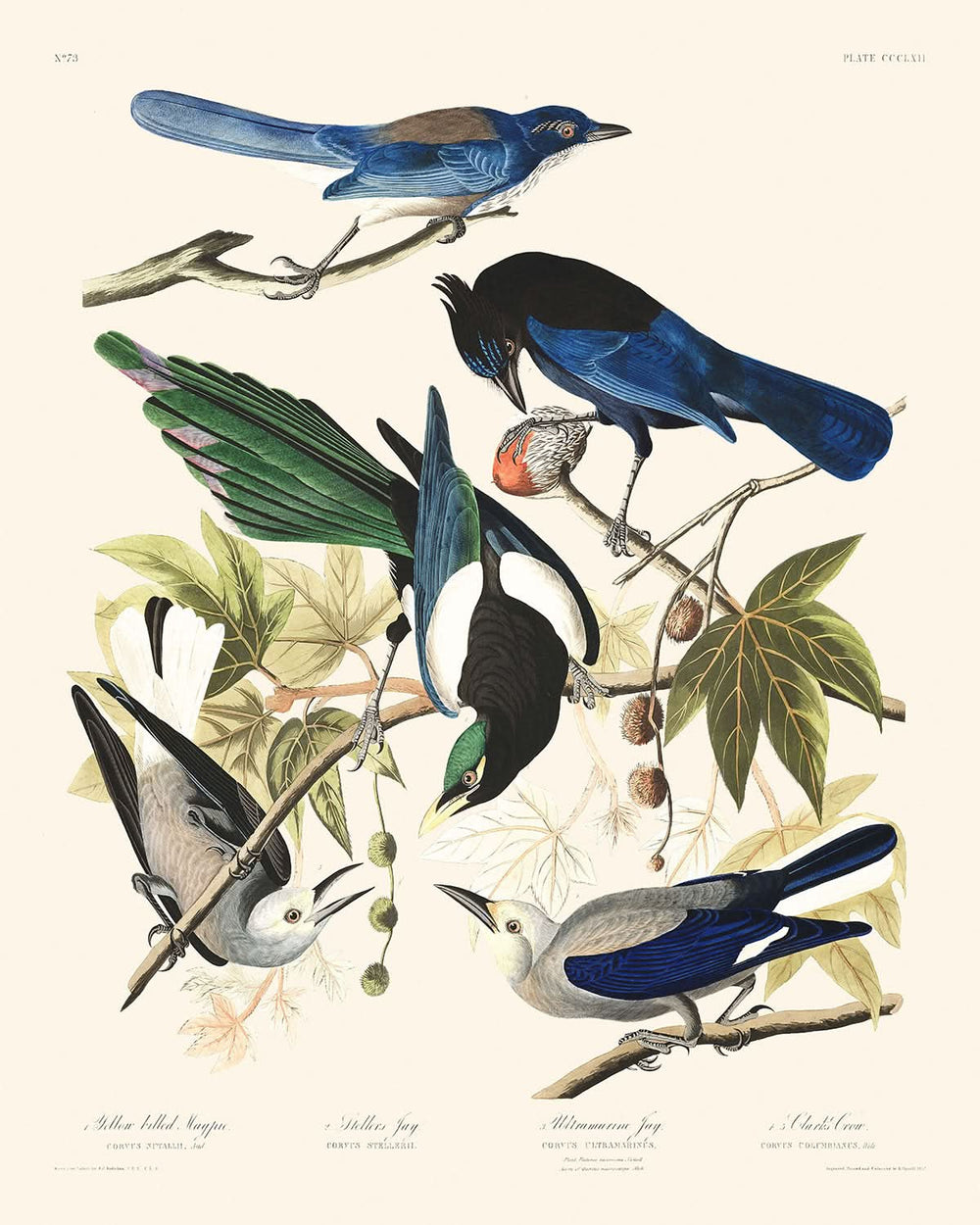 Yellow-Billed Magpie, Steller's Jay, Ultramarine Jay, Clark's Crow, first published in 1827, is a captivating bird illustration that belongs to the remarkable collection of Audubon's Birds of America by John James Audubon. This exceptional artwork features some of the most intriguing bird species of North America, meticulously cataloged and portrayed by one of history's most eminent ornithologists.