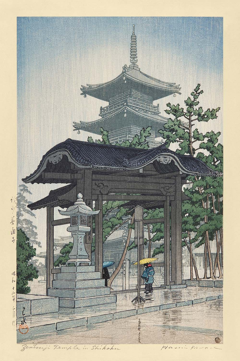Step into the serene beauty of Japan with "Zentsuji Temple in Shikoku," created by the renowned woodblock print artist Hasui Kawase in 1935. This masterful composition, whose original Japanese title may have been "Shikoku Zentsūji," pays homage to one of Shikoku’s most venerated temples—Zentsū-ji, the revered birthplace of the Buddhist monk Kukai (Kōbō Daishi). Kawase’s depiction is imbued with the tranquil atmosphere characteristic of his iconic shin-hanga style, inviting viewers to experience the calm of temple grounds just as the artist saw them.