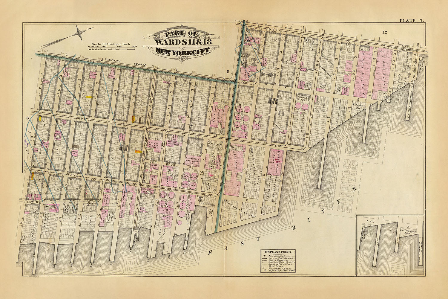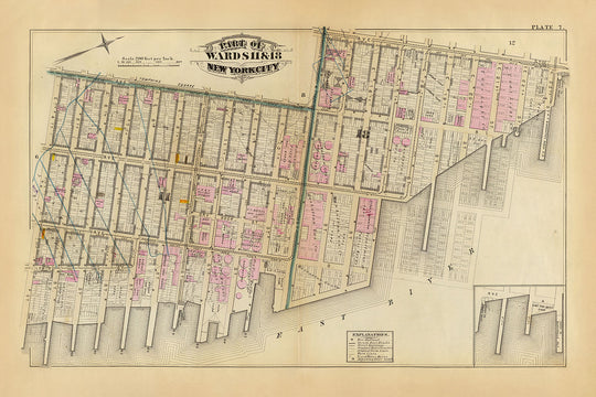 Welcome to a historical journey through the Lower East Side of New York City as it was in the year 1879. This exquisite map, part of an atlas produced by G.W. Bromley, provides an intricate look at parts of Wards 11 and 18, offering a unique snapshot of the city during a pivotal time in its history. The hand-colored lithography enhances the visual appeal of the map, highlighting features such as buildings, fire hydrants, steam and street railways, and even the original water courses that once weaved through the city's landscape.