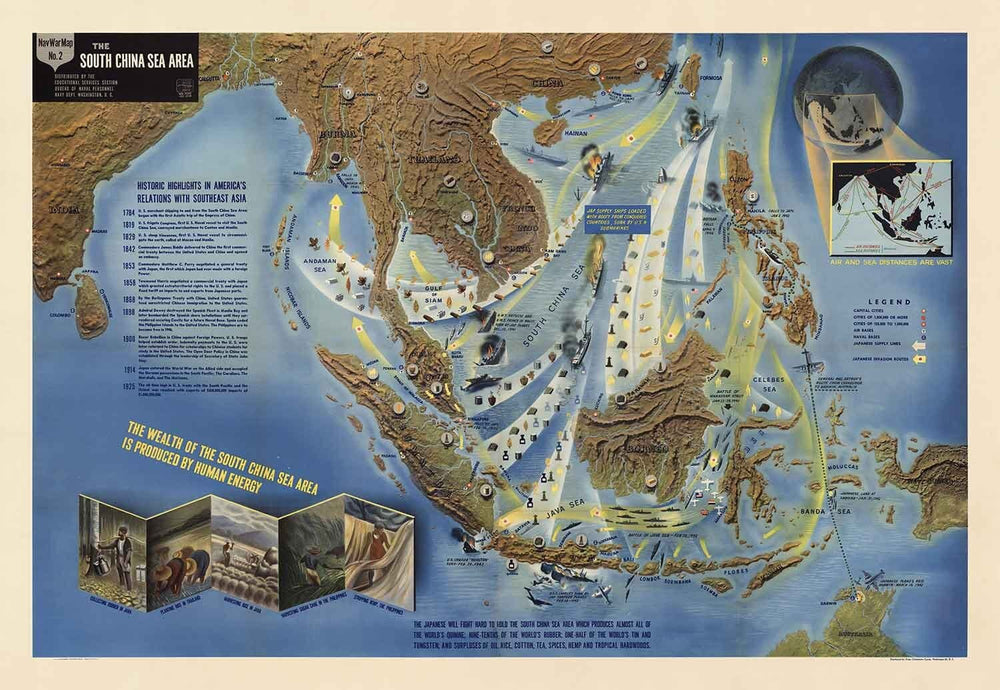 There are 6 maps in the series, each focusing on a different aspect or theatre of World War 2. This map, No. 2, focuses on the South China Sea, and the flow of Japanese supply lines and invasions.