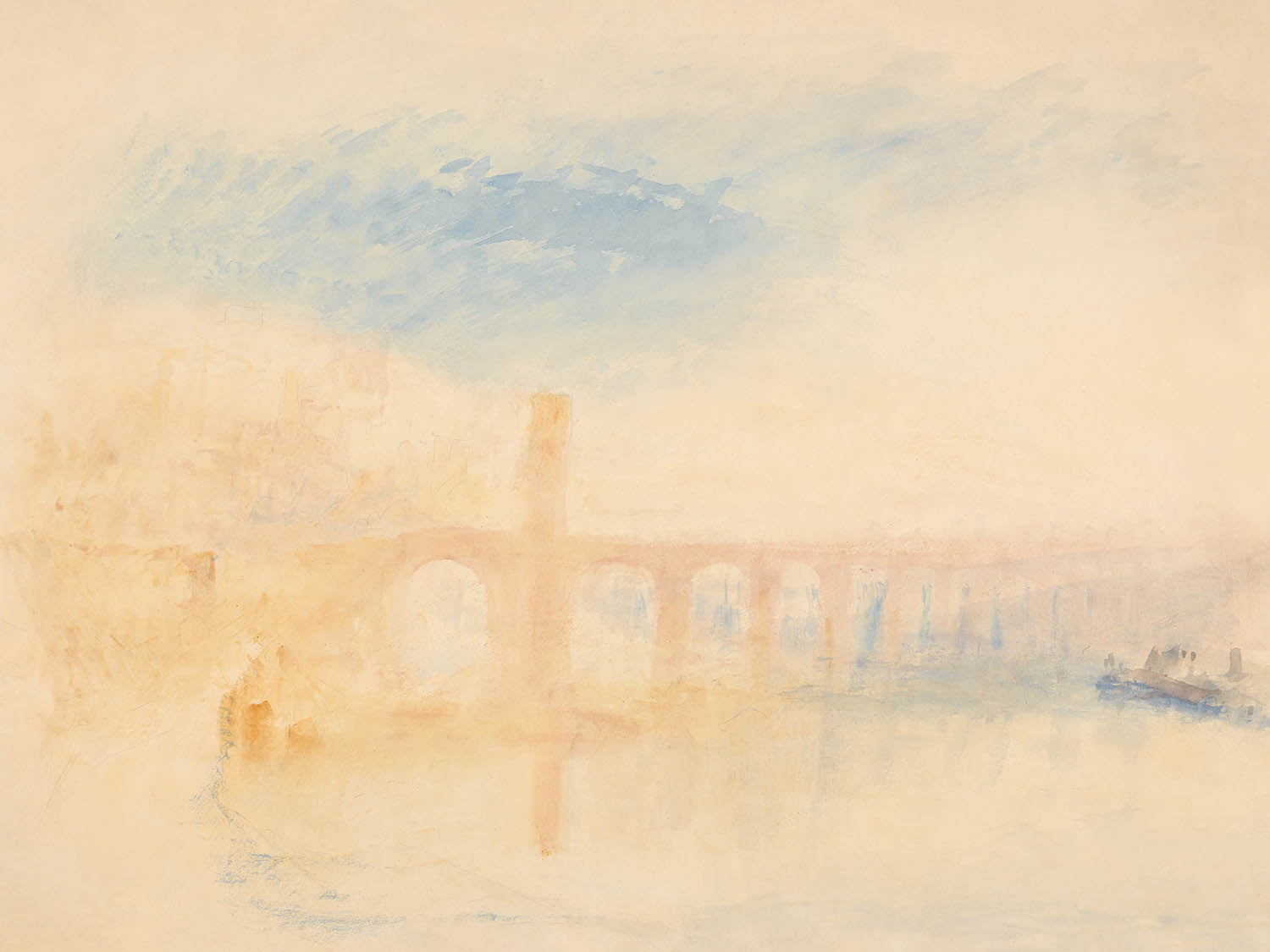 The Moselle Bridge, Coblenz stands as a testament to Turner’s notoriety for “painting with light.” Rendered in luminous golden yellows and tranquil blues, the artwork is enveloped in an ethereal mist, where stone arches, turbulent river, and sky merge in a dreamlike composition. The brushwork is loose and poetic, dissolving the boundaries between subject and air—inviting viewers into a softened vision where form gives way to impression. The differential glow of sunlight upon ancient masonry and gentle water glistens with warmth and clarity, transporting the beholder to a place where memory, history, and landscape entwine.