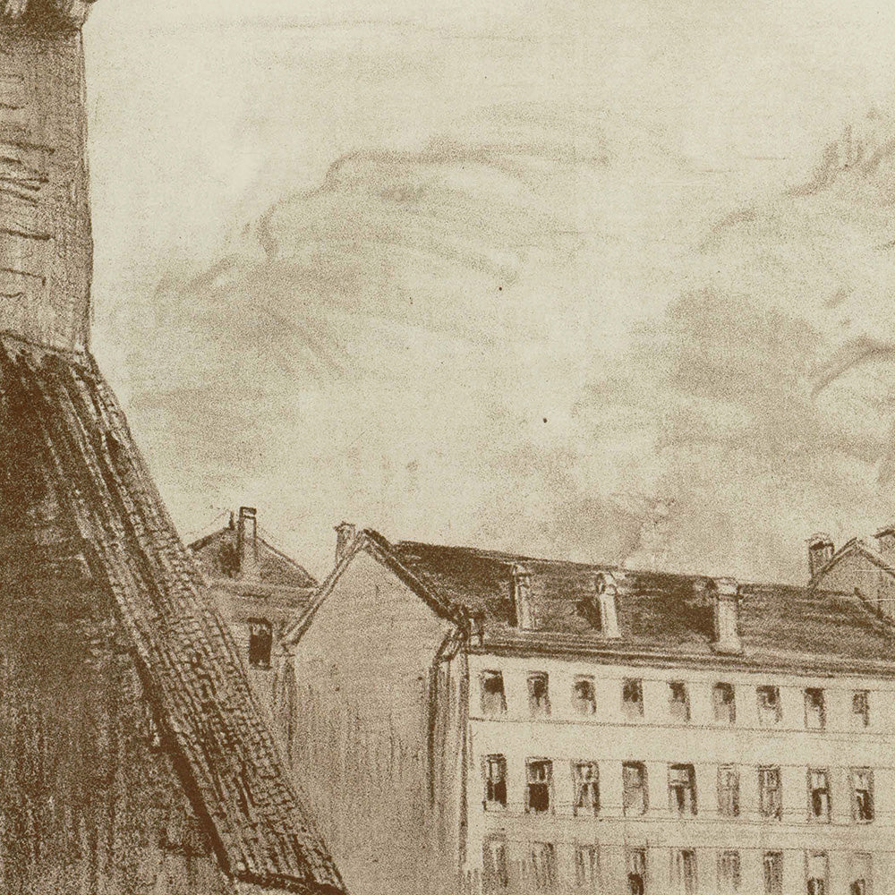 Chemins de Fer de l’Est; Bar-le-Duc, tour de l’horloge by Albert Robida invites you to the hilltop heart of Bar‑le‑Duc in France’s Meuse, Lorraine. Created as an advertising poster for the Eastern Railway, Robida sets the massive Tour de l’Horloge against a soft, cloudy sky while the upper town tumbles down the slope in sun‑washed stone. A flock of birds turns around the tower’s corbelled clock, and at lower right he even adds a tiny vignette labeled “Ligier Richier — Mausolée de René de Châlons,” a nod to the town’s celebrated Renaissance sculpture. The palette is quietly luminous—beige grounds, earthy browns, and selective washes of green that animate the terraced trees in the foreground.