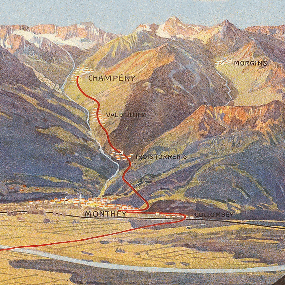 Monthey-Champéry. Aigle-Ollon-Monthey by Anton Reckziegel (1909) captures the romance of early Swiss travel at the moment railways were transforming alpine life. In this classic Art Nouveau–influenced poster, a pastoral shepherdess and her goats overlook a sweeping Chablais landscape framed within a bold circular vignette, while elegant lettering advertises the routes linking Aigle, Ollon, and Monthey to the high valley of Champéry. Created at the height of Switzerland’s tourism boom, the work balances decorative flourish with geographic clarity, inviting the viewer into a world of mountain air, winding rails, and luminous light.