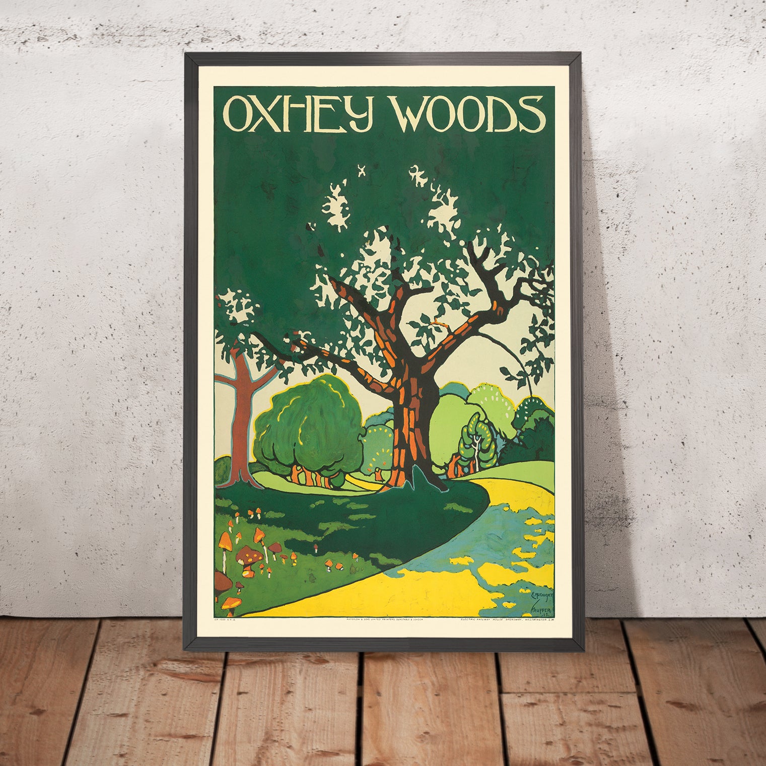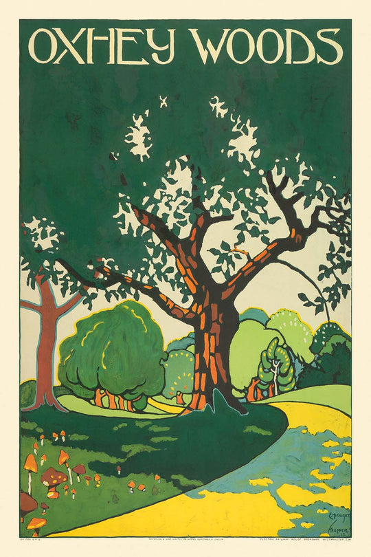 The subject itself—Oxhey Woods—points to the London of weekend rambles and fresh air, part of a broader cultural shift when the Underground promoted day trips to the countryside. In 1915, stylized poster art was redefining how destinations were advertised: less literal portrait, more distilled mood. This design captures the serenity of a woodland just beyond London’s bustle, making it a perfect keepsake for those who’ve walked its paths or cherish the green belt north‑west of the city.