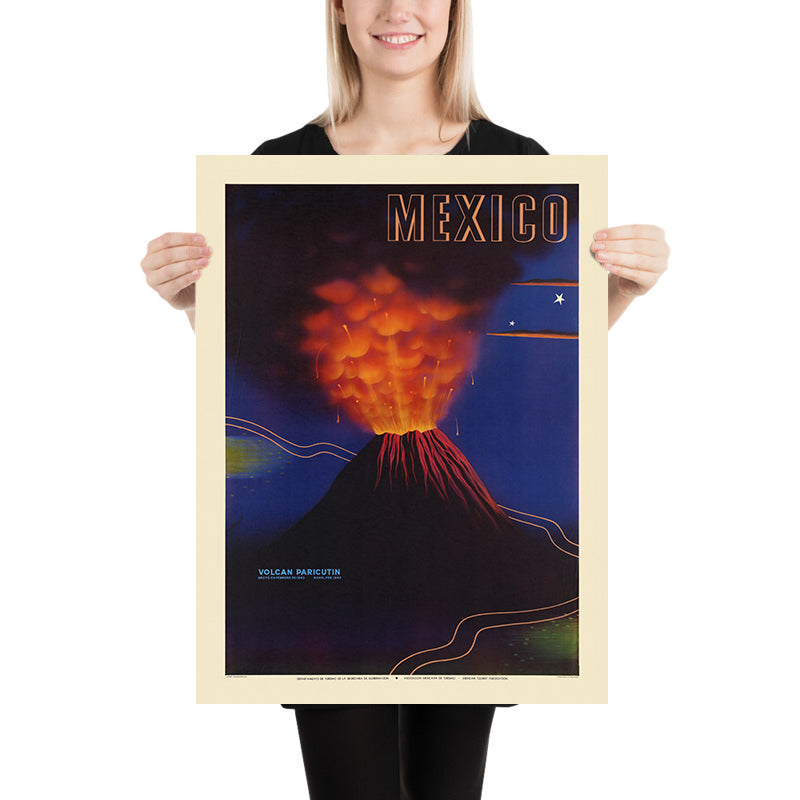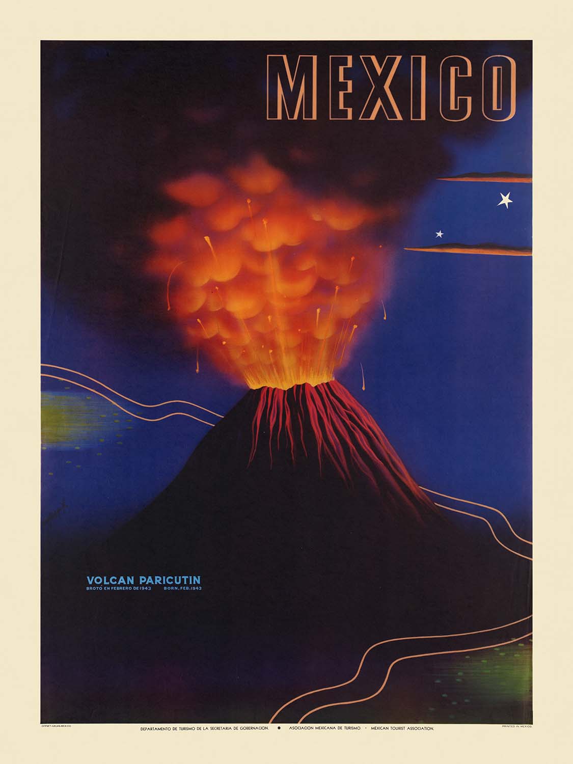 Mexico. Volcan Paricutin introduces the awe-inspiring birth of Parícutin (often anglicized as Paricutin) in western Mexico, rendered by an anonymous mid-century poster artist. Emerging suddenly from a farmer’s field in 1943, this cinder-cone volcano captivated the world and quickly became a symbol of Mexico’s natural wonder and resilience. In this travel-poster design, the volcano rises like a pyramid against a deep, twilight-blue sky as a brilliant eruption blooms above the cone—an image that echoed the country’s post-revolutionary cultural revival and its celebration of dramatic landscapes.