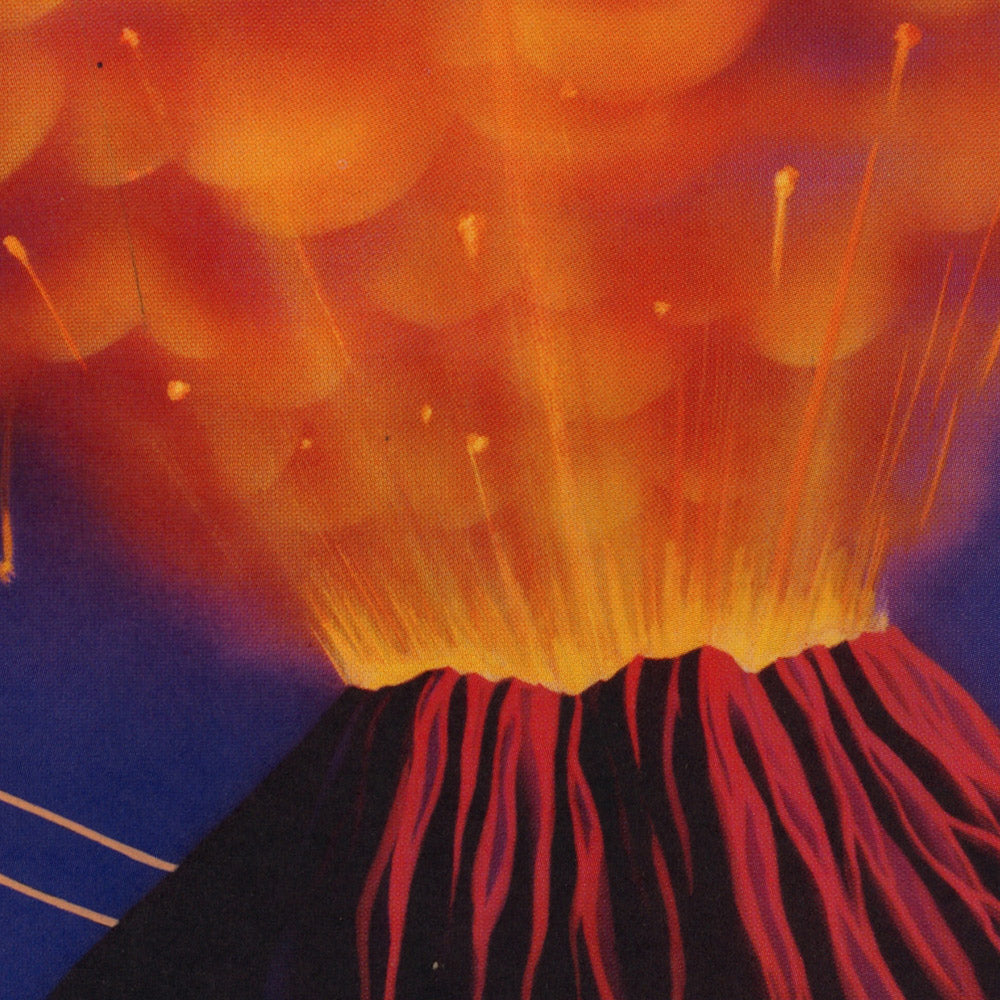 Color is the protagonist here. Luminous reds and oranges flare from the crater, arcing in a circular burst that reads as pure motion, while inky blacks and midnight blues anchor the mountain and foreground. Smooth sky gradients soften the drama, and crisp, angular silhouettes add a modernist clarity. The result is visually magnetic: a statement piece that pairs beautifully with interiors featuring warm wood tones, leather, or minimalist monochrome schemes, and a striking counterpoint to coastal blues or desert neutrals.