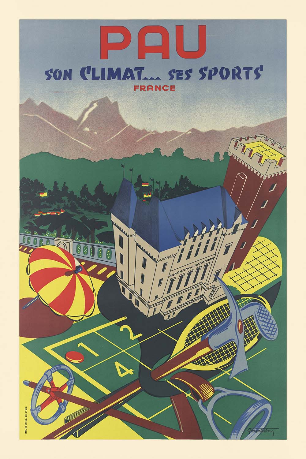 The subject of this poster—Pau, with its temperate weather and tradition of open‑air sport—was a natural star of 1930s tourism. Long known for elegant promenades and access to the Pyrenees, the city cultivated a reputation for tennis, golf, and seasonal events that drew visitors seeking wellness and sunlight. Reben’s 1935 design distills that message: Pau is cosmopolitan yet relaxed, where gardens, terraces, and courts are as much a part of the city’s identity as its cultural life.