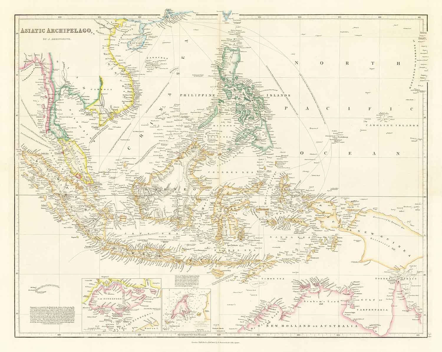 A gorgeous map of East Indies and Malay Archipelago, originally published in 1859 by probably the most sought after mapmaker of the mid-19th century, John Arrowsmith.