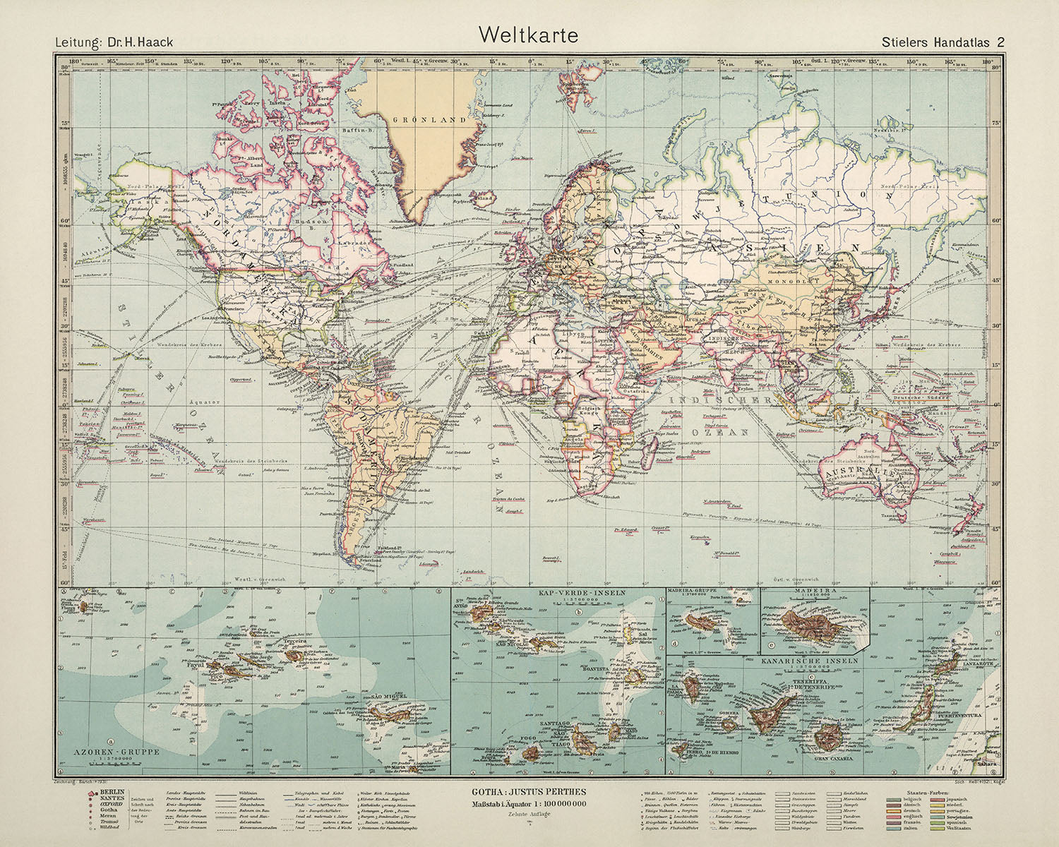 Lastly, the "Weltkarte" is a testament to the cartographic prowess of Adolf Stieler and the publishing acumen of Justus Perthes. The map's detailed representation of the world, coupled with its artistic style, is a testament to their dedication to their craft. The projection of the map is also noteworthy, as it provides a clear and accurate depiction of the world's geography. In summary, the "Weltkarte" is more than just a map; it is a historical artifact, a work of art, and a testament to the enduring power of cartography.