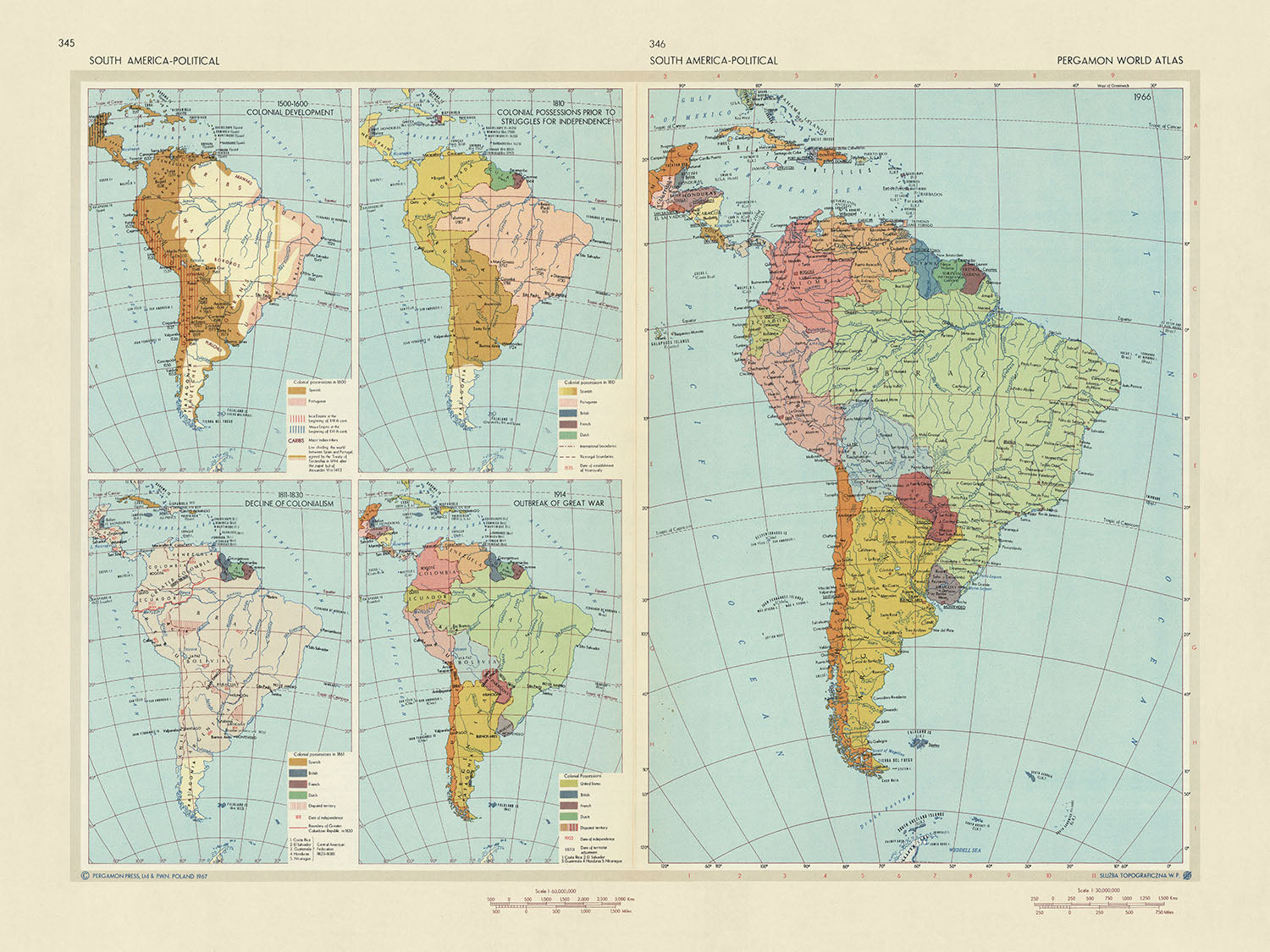 - Five inset maps show the colonial development of South America from 1500 to 1600, the colonial possessions prior to the struggles for independence in 1810, the decline of colonialism from 1811 to 1830, the outbreak of the Great War in 1914, and the current counties in 1966.