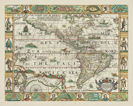 Embark on a journey through time with "A New, Plaine and Exact Map of America," a masterpiece crafted by the esteemed Robert Walton in 1658. This captivating map is a quintessential example of the carte-à-figures style, a decorative approach that frames the map with artistic portrayals of native peoples and bustling cityscapes. Walton's creation is a testament to the age of exploration, reflecting the curiosity and ambition of 17th-century Europe as it sought to chart the unknown territories of the New World.