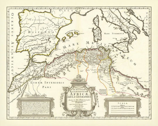 Decorative cartouches and annotations add to the map's allure, providing both aesthetic appeal and valuable information. These elements, combined with the detailed depiction of regions such as Italy, Spain, and the Balearic Islands, create a map that is as informative as it is beautiful. In Notitiam Ecclesiasticam Africae Tabula Geographica is more than a map; it is a work of art and a historical document, offering a unique perspective on the ancient world and its enduring legacy.