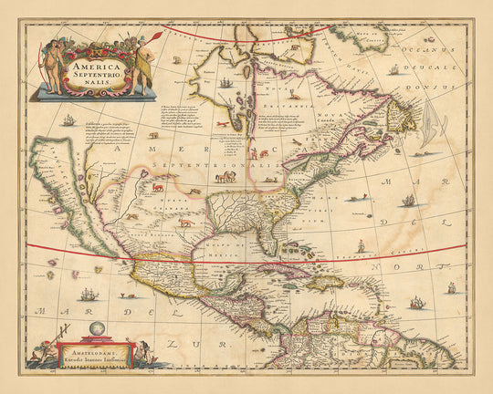 The 'America Septentrionalis' is not just a map, but a vibrant tableau that captures the diversity of the natural world. The hand-colored outline beautifully highlights the political boundaries, cities, towns, and waterways. The map also illustrates the topography of the land, with pictorial representations of mountains and wildlife. A stunning vignette of ships sailing in the sea serves as a testament to the era's maritime explorations.