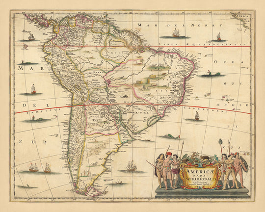 The map features prominent cities such as Brasilia and Buenos Aires, alongside notable landmarks like the Falkland Islands and the Galapagos Islands. The vast expanse of the Amazon Rainforest is also beautifully depicted, offering a glimpse into the rich biodiversity that characterizes this part of the world. Each city, landmark, and region is meticulously detailed, reflecting Visscher's commitment to accuracy and his exceptional artistic talent.