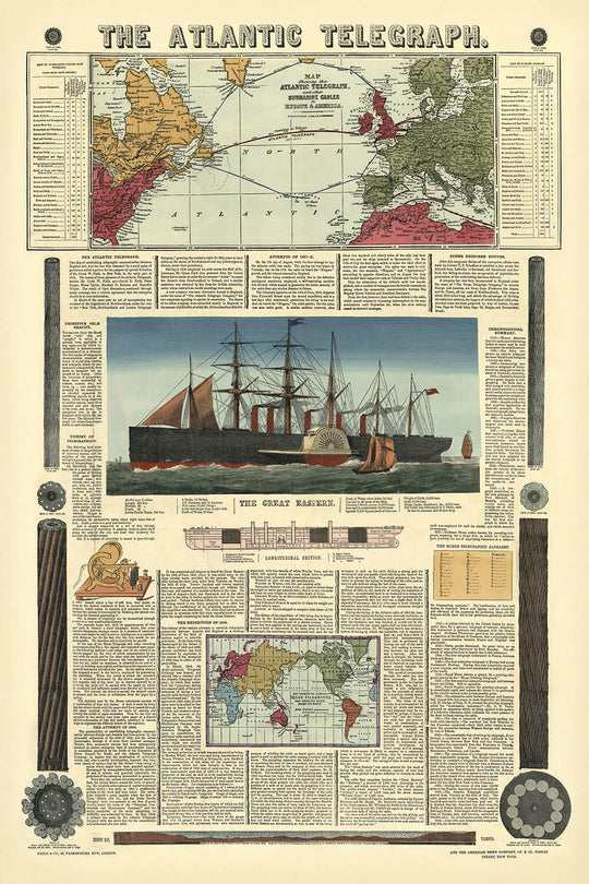 The centerpiece of this map is the beautifully illustrated Great Eastern steamer ship, the vessel that made the transatlantic telegraph cable a reality. This ship, a marvel of its time, is depicted in stunning detail, accompanied by a longitudinal section that offers a glimpse into its impressive construction. The map also includes a wealth of informative text, chronicling the history and significance of the Atlantic Telegraph, the challenges faced during its laying, and the ultimate success of the 1866 expedition. This narrative enriches the map, making it not just a visual delight but also an educational treasure.