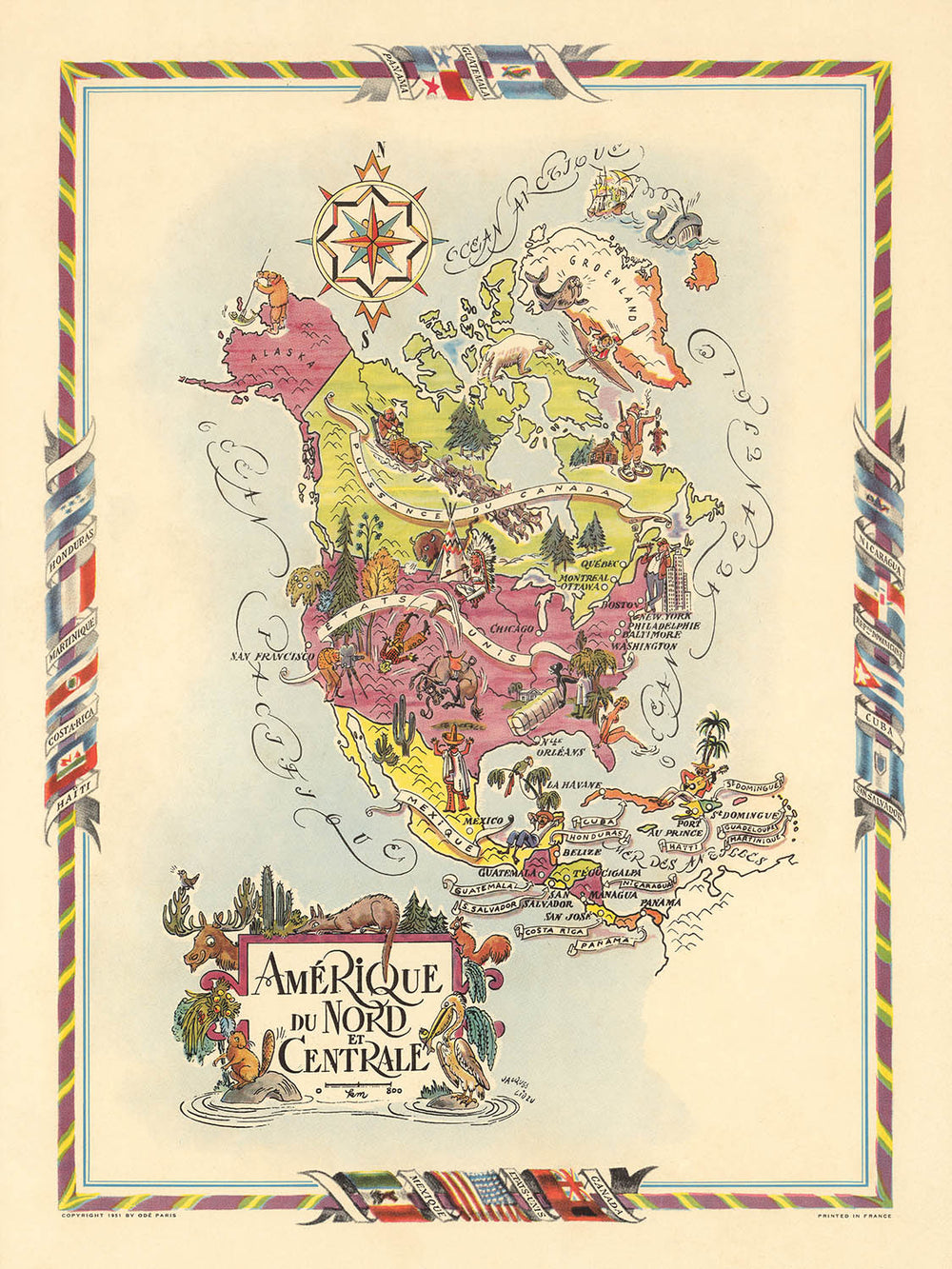 Old Pictorial Map of North & Central America by Liozu, 1951: Major Cities, Wildlife, USA, Caribbean