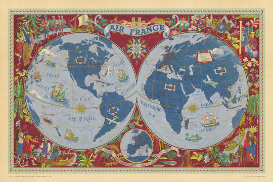 This map is not just a visual delight but also a rich source of historical context. It captures the essence of the mid-20th century, a time when air travel was becoming increasingly accessible and Air France was at the forefront of this revolution. The mapmaker, Lucien Boucher, brought his unique artistic vision to this piece, blending cartographic precision with imaginative illustrations. His background in Surrealism and his experience in designing for Air France are evident in the map's captivating design.