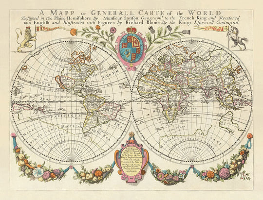 Most world maps from this era are in the 'Dutch style' with heavy embellishments around the maps. Blome's map is a little more sparse... and well, a bit more British.