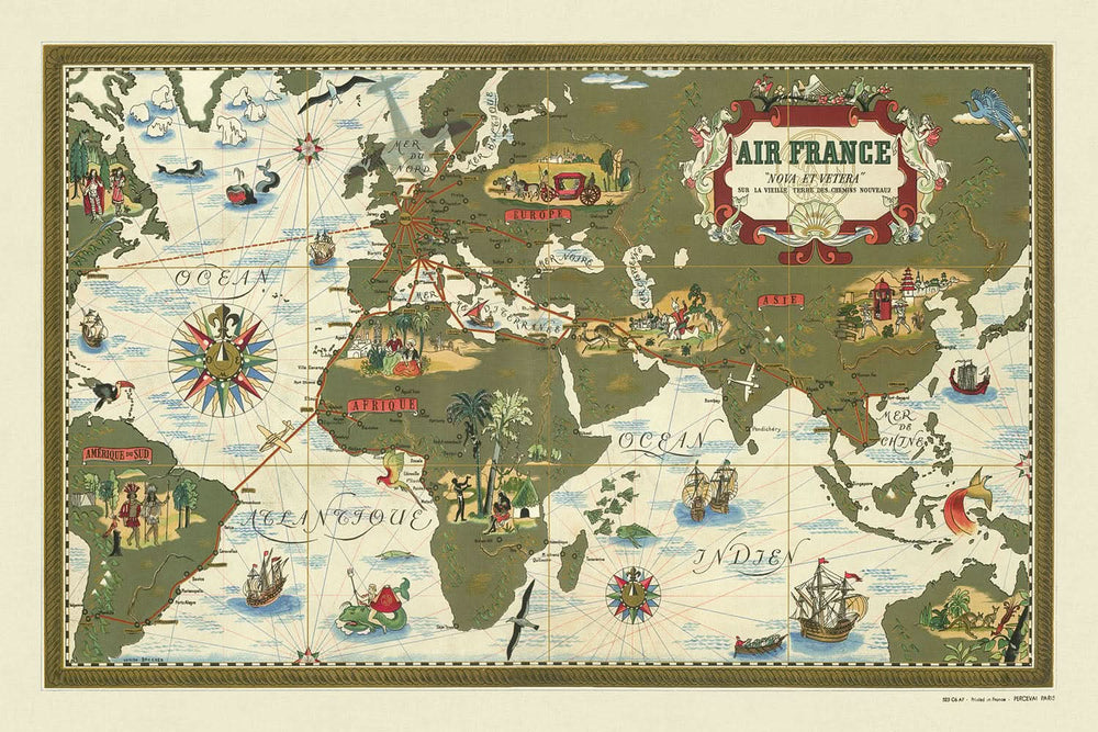 The "Nova et Vetera" map is a celebration of exploration and innovation, embodying the spirit of an age when air travel was a novel and exciting frontier. Its rich illustrations and historical context make it a compelling piece for enthusiasts of aviation history and cartographic art alike. Whether displayed as a centerpiece or cherished as a collectible, this map is a timeless reminder of the journey from the old world to the new, charted across the skies by Air France.