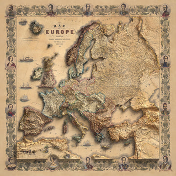The "Map of Europe," published by Ensign, Bridgman & Fanning in 1855, is a stunning example of mid-19th century cartography. This full-colour map beautifully captures the political and physical geography of continental Europe, extending all the way to the Ural Mountains in the east and encompassing Turkey and Syria. The map is framed by intricate portraits of prominent figures of the era, including Queen Isabella II of Spain, Napoleon III of France, Queen Victoria of England, and other notable rulers, reflecting the political landscape and monarchical power of the time.