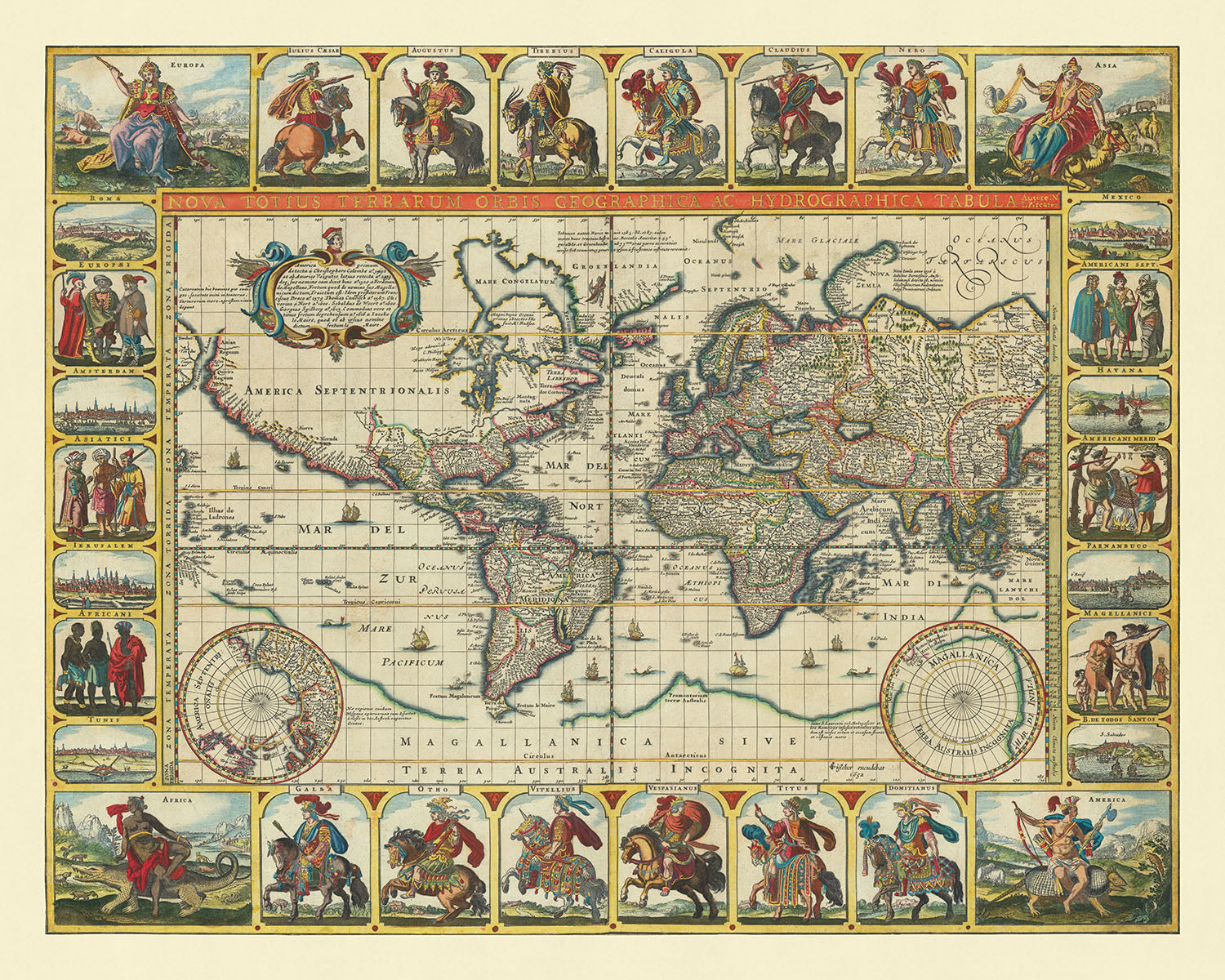 The map's design and style are a feast for the eyes, characterized by its hand-colored engraving that brings to life the political landscape of the 17th century. The Nova Totius Terrarum Orbis is adorned with elaborate borders and vignettes that narrate the world beyond mere geography. The inclusion of the Twelve Caesars, mounted Roman emperors in the decorative borders, infuses the map with a sense of historical depth and grandeur. These emperors, each depicted in elaborate suits of armor, serve as guardians of the ancient world's knowledge, overseeing a map that is as much a political statement as it is a geographical one.