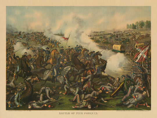 Die Schlacht von Five Forks war entscheidend für ihre Rolle als Signal für die bevorstehende Niederlage der konföderierten Streitkräfte und die anschließende Kapitulation in Appomattox. Das Werk vermittelt meisterhaft die chaotische Energie und die brutalen Realitäten des Krieges und manifestiert sowohl den Mut als auch die Turbulenzen der Zeit. Die verwendete fortschrittliche Chromolithographietechnik ermöglichte eine reiche und detaillierte Darstellung, was dieses Kunstwerk zu einem bedeutenden technologischen Fortschritt des 19. Jahrhunderts macht.