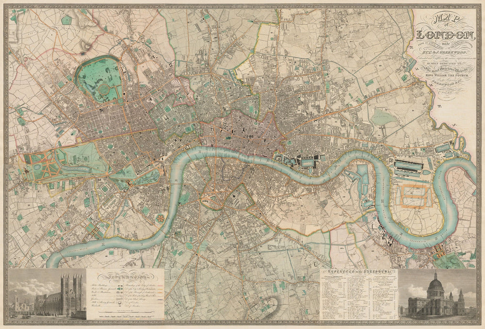Große alte Karte von London von C&J Greenwood, 1830: Handkoloriert