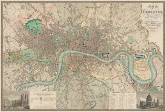 Ursprünglich in 6 Blättern gedruckt, ist dies wahrscheinlich die schönste aller alten Londoner Karten. In den 1830er Jahren gab es bereits viele der berühmten Wahrzeichen Londons - aber einige, wie die Royal Albert Hall und alle Museen in South Kensington, wurden erst in der viktorianischen Zeit einige Jahrzehnte später gebaut.