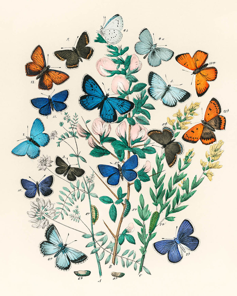 "Schmetterling und Nachtfalter," erstmals 1882 veröffentlicht, zeigt die detaillierte und lebendige Kunstfertigkeit von Willem Forsell Kirby, einem prominenten viktorianischen Zoologen, der für seine umfangreichen Arbeiten über Insekten bekannt ist. Diese schöne und hochdetaillierte Illustration fängt sowohl die Eleganz als auch die Komplexität von Schmetterlingen und Nachtfaltern ein und macht sie zu einem auffälligen Stück für jeden Natur- oder Kunstliebhaber.