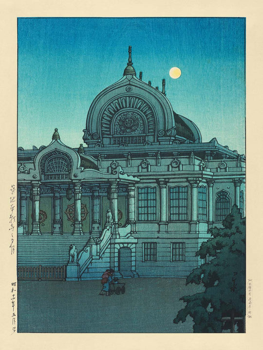 "Der Abendmond am Honganji-Tempel in Tsukiji" hebt sich als ein zutiefst ruhiges Werk hervor, das architektonische Harmonie, mondbeschienene Reflexionen und das gedämpfte Treiben des Abends in der Stadt poetisch integriert. Vor der beeindruckenden Tempelarchitektur leuchtet der zunehmende Mond sanft über uns, spiegelt sich in den stillen Wassern des Tempels und erleuchtet das Tempelgelände mit einer kühlen Gelassenheit. Diese Szene vermittelt sowohl die Pracht als auch die wiederherstellende Stille heiliger urbaner Räume – ein Markenzeichen von Hasuis Fähigkeit, Stimmung einzufangen.