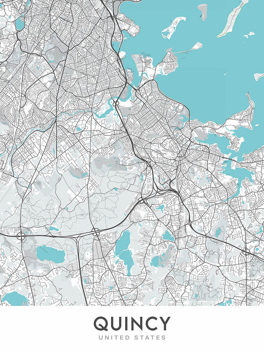 Moderne Stadtkarte von Quincy, MA: Adams Nationalpark, Blue Hills Reservation, Friedhof, Markt, Wollaston Beach