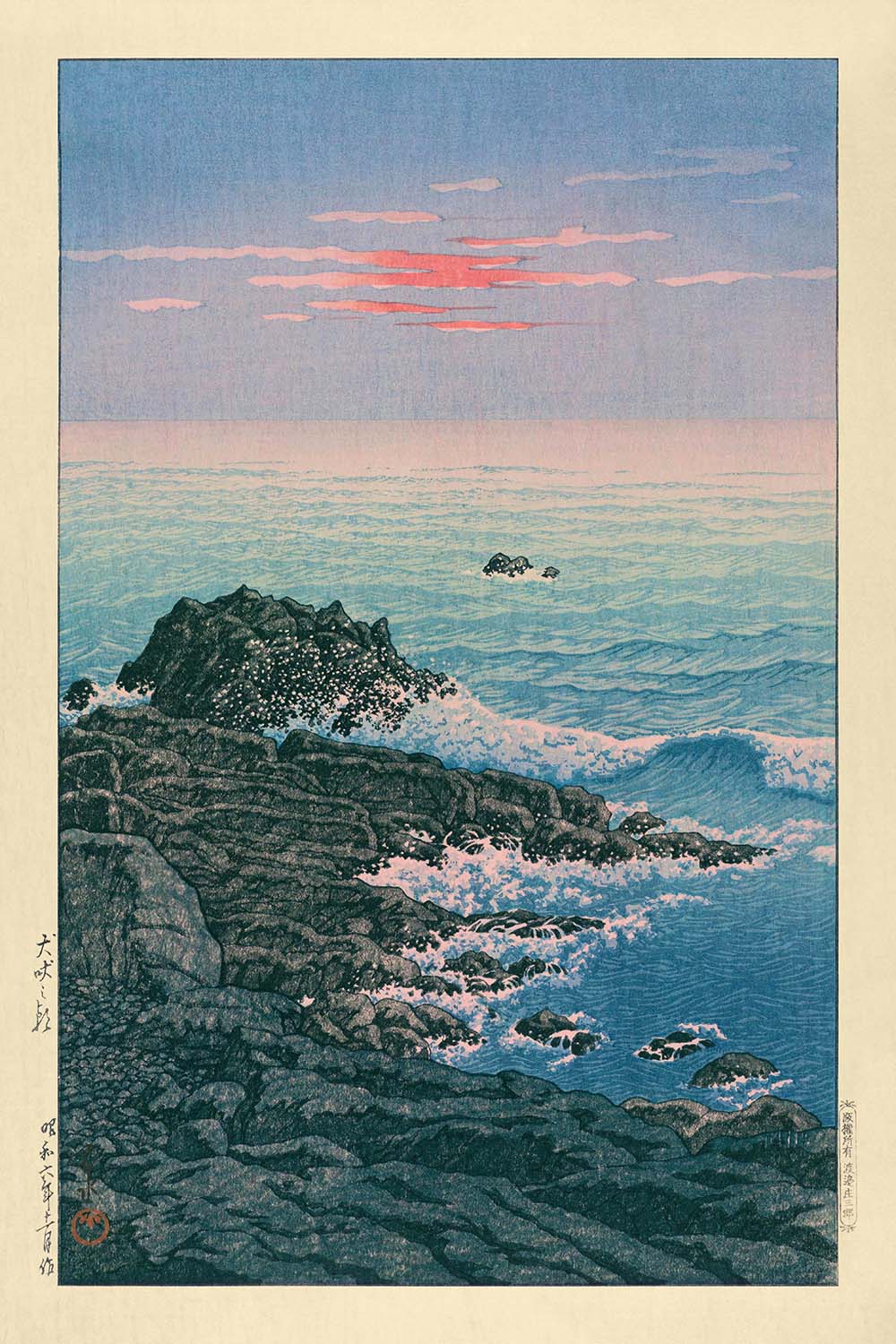 Das subtile Zusammenspiel von Blau und Pink, akzentuiert durch gedämpfte Erdtöne, verleiht diesem Stück eine zurückhaltende Eleganz, die nahtlos zu verschiedenen Einrichtungsstilen passt. Der Besitz eines Drucks von Morgen am Cape Inubo von Hasui Kawase ermöglicht Kunstliebhabern, die beruhigende Essenz der Küstenschönheit Japans zu erleben und Ruhe und Besinnung in jeden Raum einzuladen.