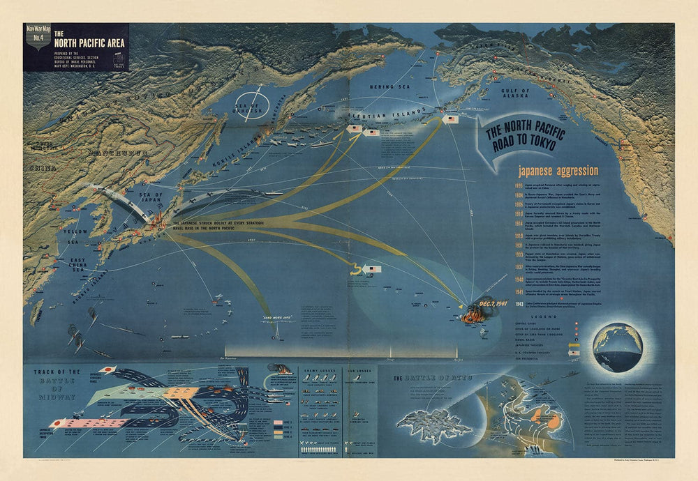 In der unteren linken Ecke ist ein detaillierter Plan der Schlacht von Midway, mit einem Tally der freundlichen und feindlichen Verluste (natürlich haben die USA nicht viel verglichen mit den Japanern verloren!) Unten rechts ist ein Plan der Schlacht von Attu.
