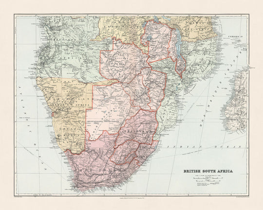 Die 1904 von Edward Stanford sorgfältig gestaltete Karte „Britisch-Südafrika“ ist ein Zeugnis der reichen Geschichte und der geographischen Komplexität der Region während der Blütezeit des Britischen Empires. Die Karte, eine detaillierte politische und physische Darstellung, erfasst das gesamte Ausmaß von Britisch-Südafrika, einschließlich der Kapkolonie (Südafrika), Transvaal, des Protektorats Betschuanaland, Nordwestrhodesien, Nordostrhodesien, Britisch-Zentralafrika, Mashonaland und Matabeleland. Die Region ist in einem auffälligen Rotton hervorgehoben, der die Aufmerksamkeit des Betrachters sofort auf die Breite des britischen Einflusses auf dem gesamten Kontinent lenkt.
