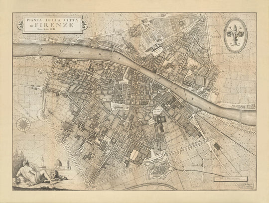 Alte Karte von Florenz, Firenze, 1847 von Molini & Ruggieri: Uffizien, Santa Croce, Santo Spirito, Dom, Plätze, Paläste, Ponte Vecchio