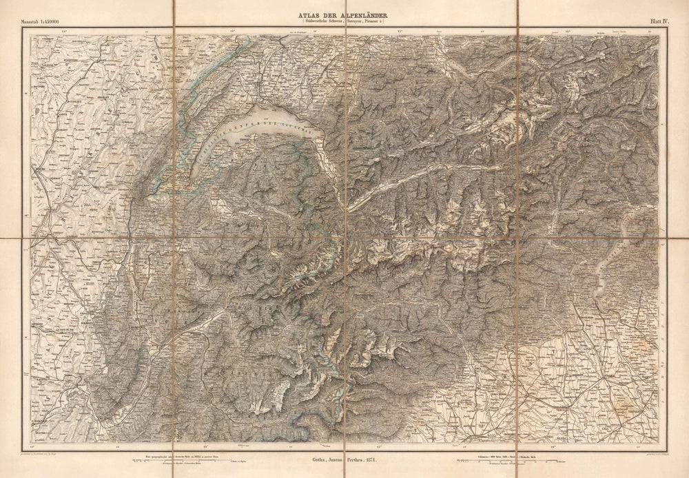 Alte Karte der Alpen von 1874 von Johann Mayr: Matterhorn, Mont Blanc, Genf, Rhône, Lausanne, Grenoble, Sierre