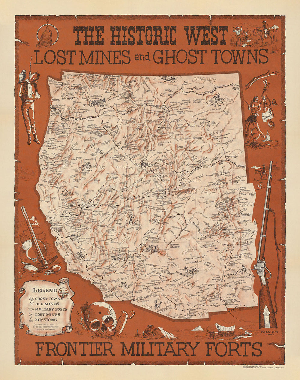 Dies ist eine sehr markante bildliche Karte von Amerika, die Geisterstädte, verlorene Minen, Militärposten und Missionen hervorhebt, die die Zeit der Cowboys, Indianer und Gesetzlosen in den Vereinigten Staaten im späten 19. Jahrhundert romantisieren.